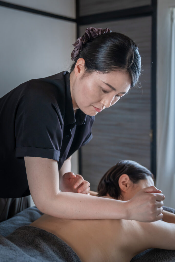 腕や肘を使い、滑らかなリズムで筋肉をほぐしていきます。