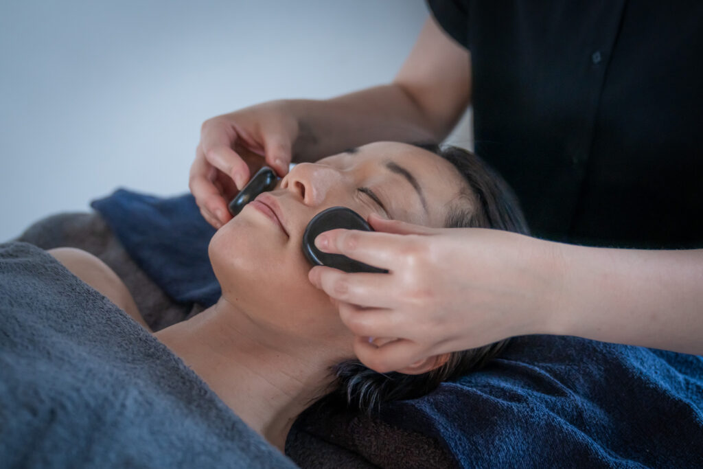 お顔に温かいストーン&冷たいストーンを交互に使用する温冷ストーンフェイシャル。
