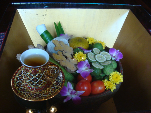 お茶を出してくださいましたが、テーブルもまた素敵。ハーブやフルーツが飾られています。